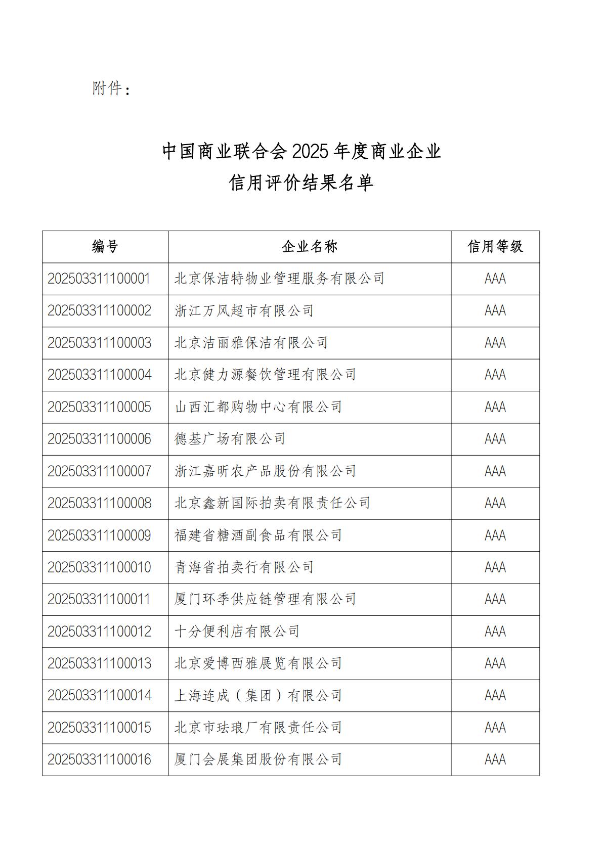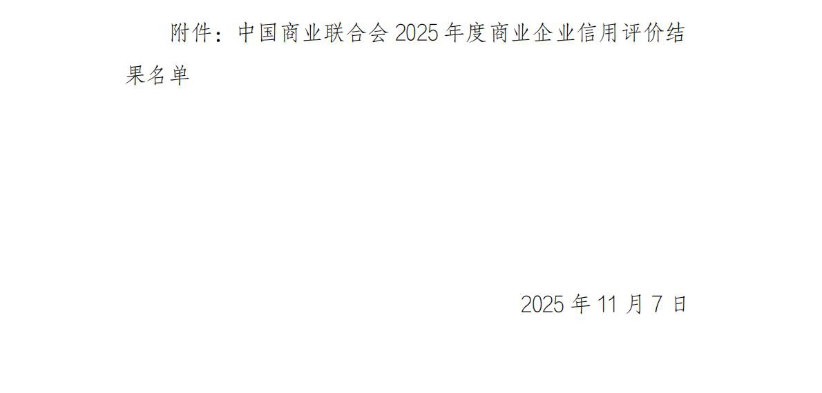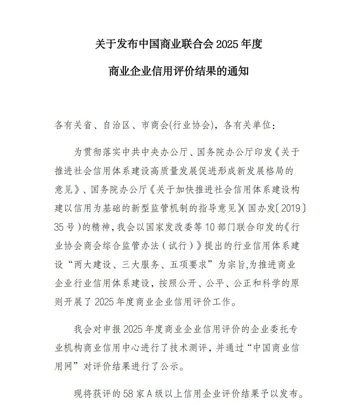 当前位置: 首页 > 通知公告 > 关于发布中国商业联合会2025年度商业企业信用评价结果的通知